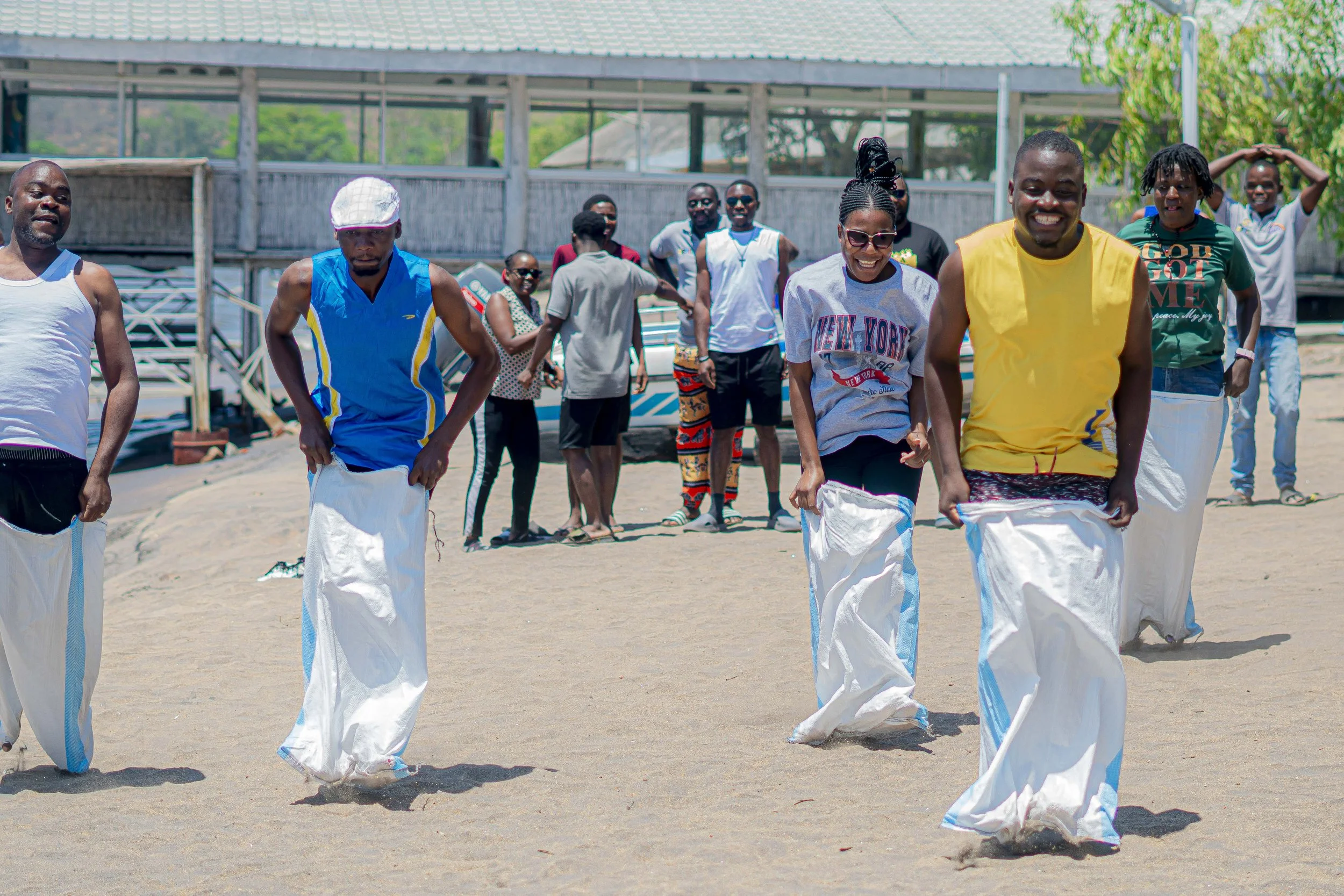 Ulalo staff bring energy and laughter to the sack race challenge during the 2025 Annual Staff Retreat in Salima